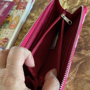 This is a NWT corduroy 2 shades of pink fabric wallet. Has 12 ccard slots; 6 on each side, and center zip change pocket. Also has an outside pouch for ID or cards in pvc.