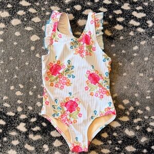 Charming floral swimsuit with ruffle details. Features vibrant pink and green floral patterns on a white background. Cute bow on the back. Wore once. Like new.
