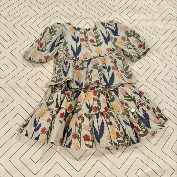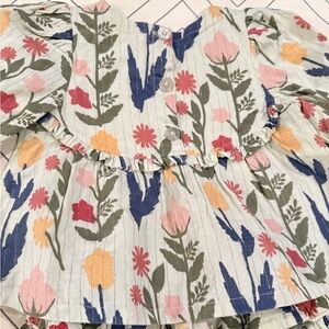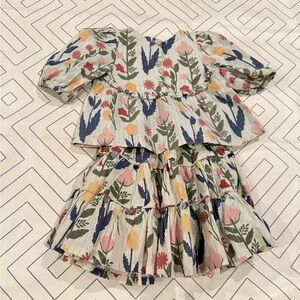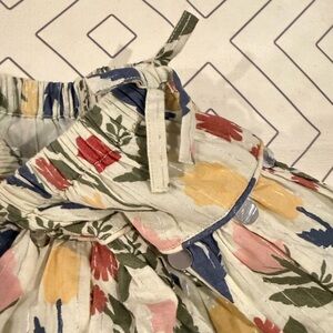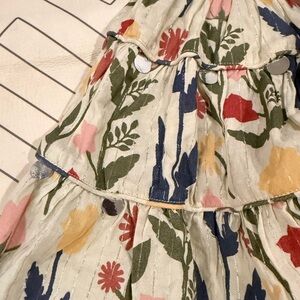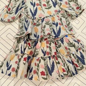 Size 2Y top and 3Y skirt. Green base color with fall floral design. Golden thin stripes. Small stain on front bib front which blends with the pattern. Pull on stretch waist tiered skirt with lining.
