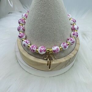 Pink Chinese-Style Ceramic Floral Beaded Stretch Bracelet w/ Bow Charm