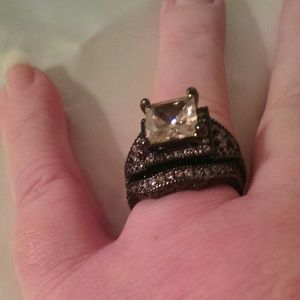 This is a beautiful set. Engagement ring and wedding band. They interlock. The main stone is about 2.5 carats. Total weight is about 4 carats. It is definitely a statement peice.