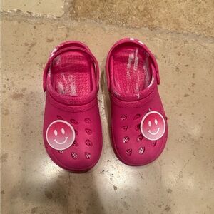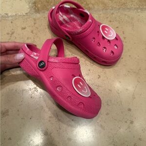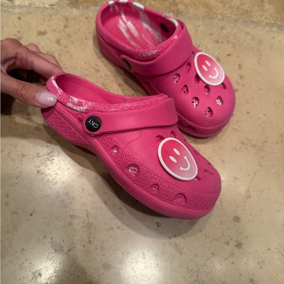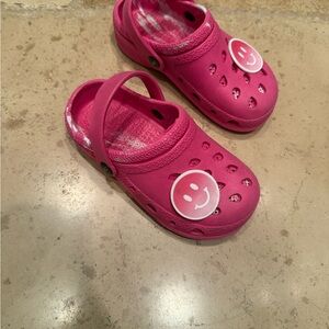 These vibrant pink slippers feature a slip-on design with a rotating heel strap for added comfort and versatility. The slippers are crafted from a durable rubber/foam material and include ventilation holes for breathability. Perfect for casual wear, they maintain their bright color and are adorned with decorative charms for a playful touch.