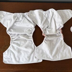 Set of pink cloth diapers in assorted patterns. Perfect for eco-friendly parents. 7 covers and 7 inserts. Elastics are in fantastic condition, freshly laundered in Tide+Oxi. Bundle and save on multiple sets!