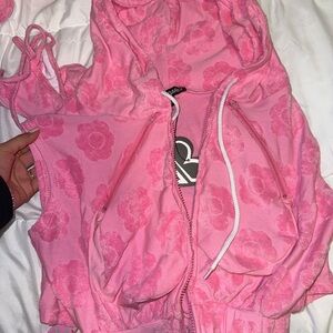 5-PIECE BARBIE PINK, TOWEL TERRY CLOTH SET. INCLUDES HEART SHAPED BRA AND THONG SWIMSUIT, HEADBAND, SKORT AND HOODIE (WITH HEART SHAPED POCKETS FOR STYLING).