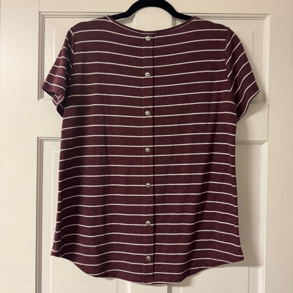 SUPER SOFT! Adorable button back detail (non-functional buttons). Maroon and white with a relaxed fit.