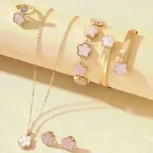 Pink Clover Five Jewelry Set: A charming jewelry set featuring pink clover-shaped motifs, including matching earrings, necklace, bracelet, and rings. Perfect for adding a delicate, feminine touch to any outfit.