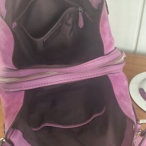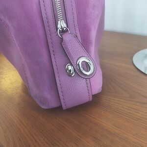 This stylish handbag is perfect for any occasion. Its elegant design and vibrant color make it a must-have accessory. Leather front with suede sides add a great touch to the look of this beauty. Only minor rubs to the suede corners
