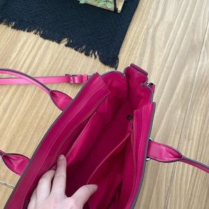 Bright Pink with pewter color hardware. Sticker for protection still on tag. Long extender strap included. Few marks on very bottom of metal and otherwise excellent condition!