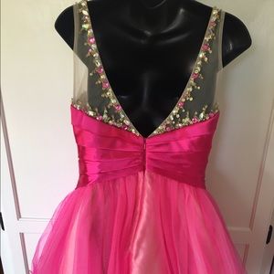 This is a gorgeous and fun short dress that is perfect for any event especially 8th grade dances, prom, etc. this is very adorable and the colors are amazing! It has a high neckline connected with mesh as pictured and was worn once for an hour. Only alterations were it was taken up in the shoulders just a bit. Perfect condition! Size Medium (fits like a 4-6 can be easily altered for your body shape)