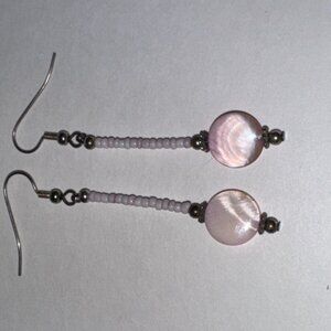 These simple yet elegant coin mother of pearl dangle earrings feature sterling silver findings, and seed beads, as well as a sterling silver French ear wire and t-wire. Each pair of earrings has seed beads the colors that correspond with the color of the mother of pearl coin. These are pink earrings, simple yet elegant.