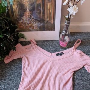 Adorable baby pink soft top with cold shoulders. Super comfortable and slightly see thru, perfect opportunity to break out that cute lacey bralette.