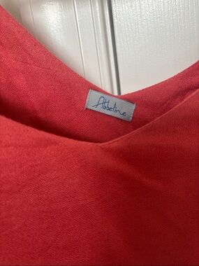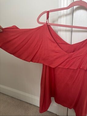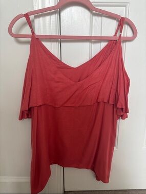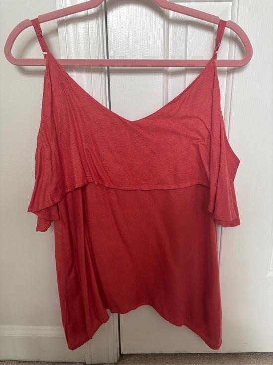 Flowy pink cold-shoulder top with soft ruffle overlay. Lightweight drape for easy layering and everyday wear. Adjustable spaghetti straps let you customize the fit. No size on tag but guessing it’s a medium.