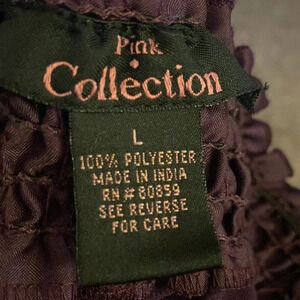 Women’s top size Large, Pink Collection brand, purple sheer material 100% polyester, flecks of gold in the scrunched part around the neckline, v neck with double strings with tassels, gathered at the waist and slight gathering at the sleeves