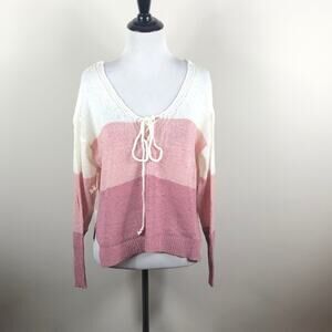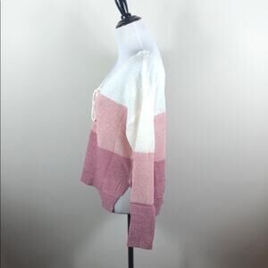 Pink v-neck lace up detail knit colorblock sweater. Lightweight, open weave. 65% acrylic, 35% polyamide.