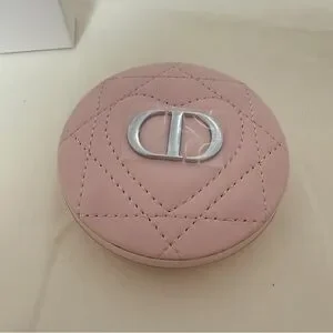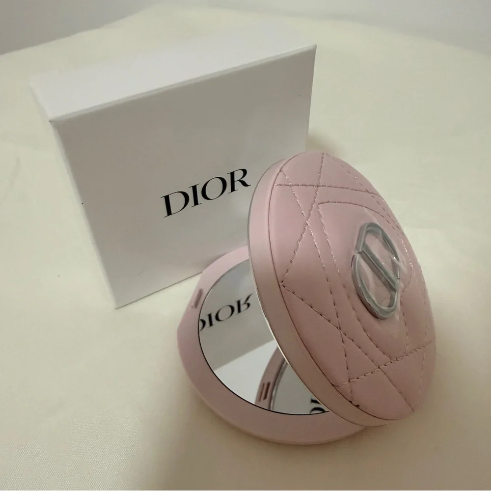Elegant Dior compact mirror in a soft pink shade. Perfect for on-the-go touch-ups.