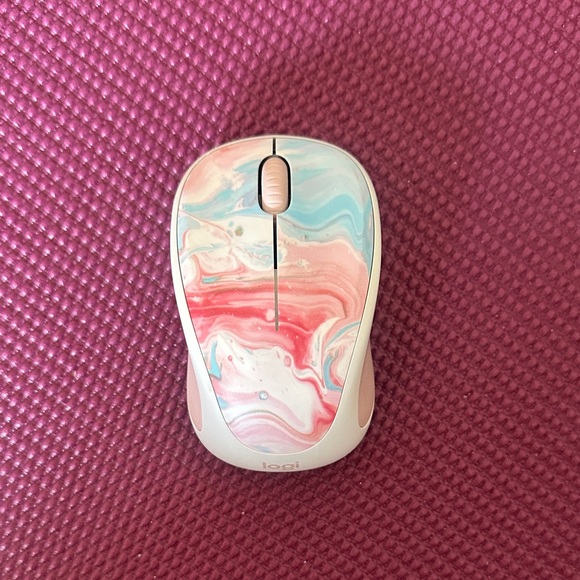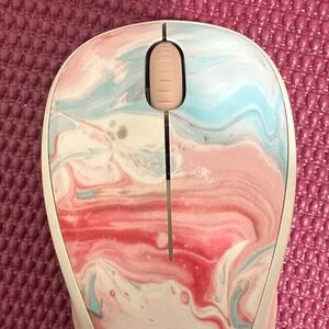 Wireless mouse with a vibrant swirl design in pink, blue, and cream.