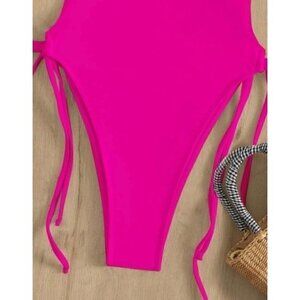 Pink Contrast Mesh Cut Out Halter One Piece Swimsuit
