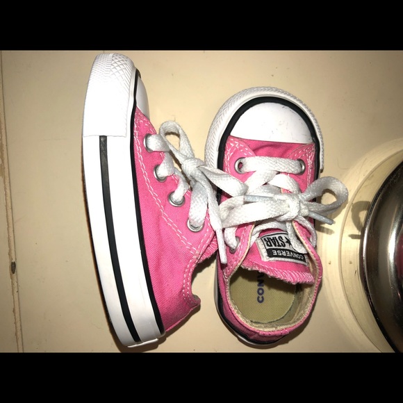 Toddler girl pink Converse sneakers. She did mark on the tip of one shoe with an ink pen. Shown in last picture. I did not try to wash it out. Other than that excellent shoes!