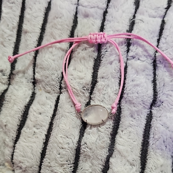 Stylish pink cord bracelet featuring an oval quartz stone centerpiece. Hand crafted. Easily adjustable.