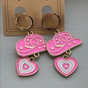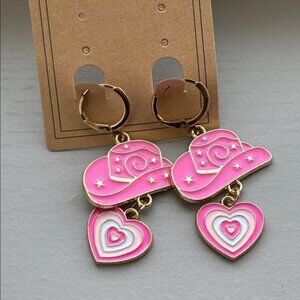 Stylish earrings featuring pink cowboy hats and heart designs. Perfect for adding a playful touch to any outfit.