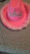 Stylish pink cowboy hat featuring a sparkling rhinestone tiara and boa feather trim.