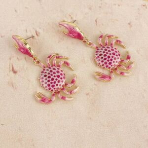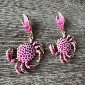 Unique pink crab earrings with polka dot design. Perfect for adding a playful touch to any outfit.