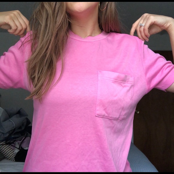 Simple crew neck gum ball pink tee with pocket. Good condition. I cannot tell the size based in the tag so large is my best guess.
