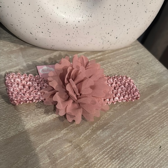 This charming hair accessory features a soft pink crochet band adorned with a large, layered fabric flower. The delicate chiffon petals add a romantic touch, making it a perfect addition to any outfit. The elastic band ensures a comfortable fit, while the textured knit pattern offers a stylish contrast to the flowing floral design.