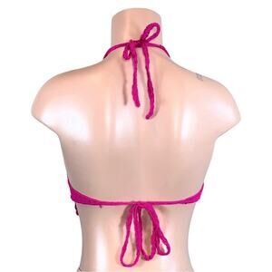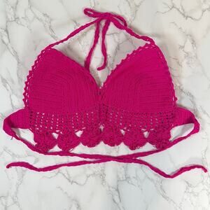 Stylish pink crochet halter top with intricate detailing. Perfect for summer.