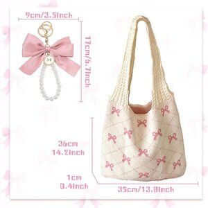 Features: Oversized tote with a charming crochet design, large enough to carry magazines, umbrellas, or all your essentials. Comes with a cute pink bow keychain for extra flair. Made from lightweight yet durable polyester, offering a soft touch without sacrificing resilience. The foldable style makes it super travel-friendly, and the buckle closure keeps your items secure.
