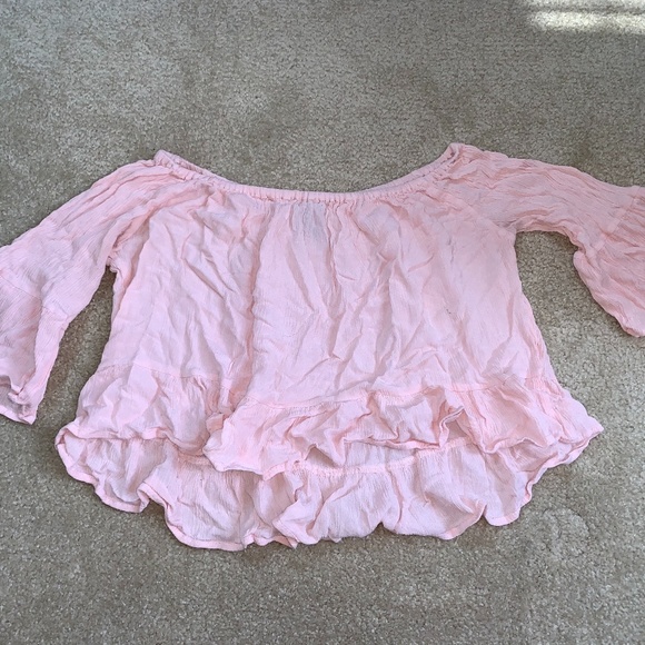Pink off-the-shoulder flowy crop top with elbow length sleeves.