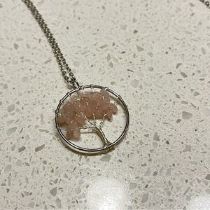 Pink Crushed Stone Silver Color Tree Of Life Necklace
