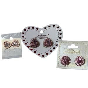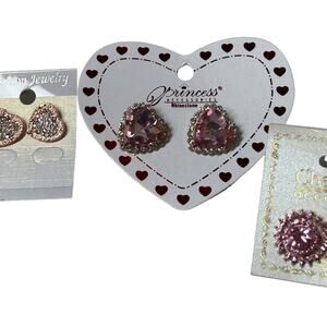 Pink Crystal Heart Rose Gold Studs Earrings - Women's Jewellery - 3 Pairs.