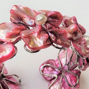 Pink Cuff Bangle with Shell and Pearls Adjustable Bracelet - NEW