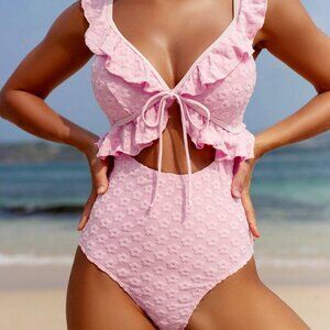Pink Cute Women's Beach Vacation Jacquard Ruffle Trim One-Piece Swimsuit