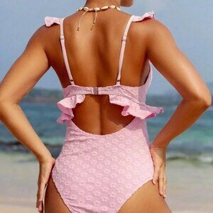 Pink Cute Women's Beach Vacation Jacquard Ruffle Trim One-Piece Swimsuit
