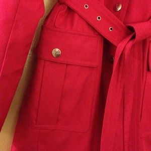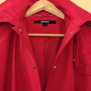 Bright pink DKNY trench coat, fully lined, snap buttons. Hits mid thigh. Has a removable hood and a belt that can be belted or tied (I usually tied). Only worn a few times, looks amazing with black patent leather shoes or bag (or both).