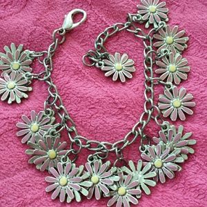 Handmade charm bracelet with pink daisy looking flowers. (Second time around).