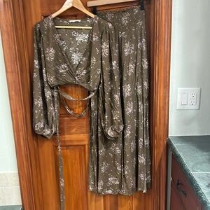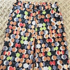 Pink and white damask pattern. Flowy light fabric, wide leg, stretchy waist.