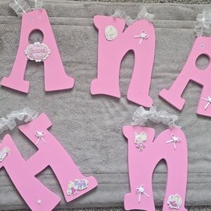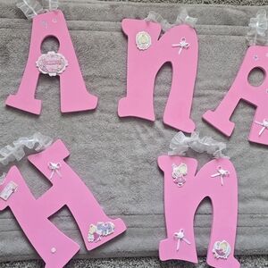 Set of pink decorative letters with white ribbons and cute embellishments. Perfect for nursery or kids' room decor.