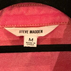 Steve Madden women’s pink size Medium button up denim shirt jacket. EUC. Worn only a few times. No stains or flaws. 100% cotton. Curved bottom hem. Nice heavy weight fabric. The last picture is a more accurate depiction of the pink color.