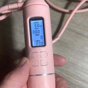 Stylish pink digital jump rope with LCD display. Perfect for fitness enthusiasts.