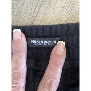 Men’s Pink Dolphin Black Joggers With Red Flames Elastic Waist Drawstring Size Large with Black Distressed With Red Dolphin Logo Hat Excellent Condition