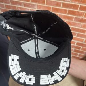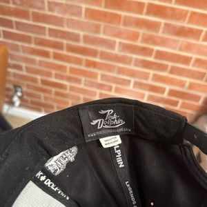 Black embroidered hat with pink dolphin on the front. Snap back batter with letters on brim.