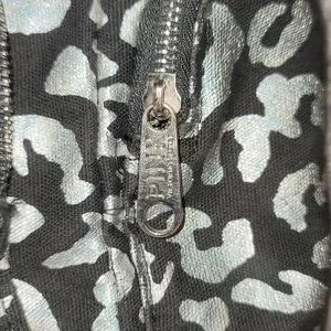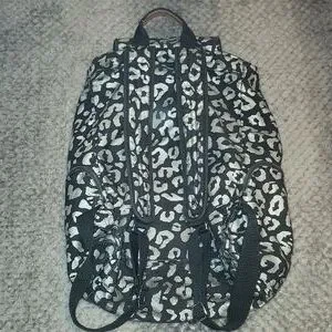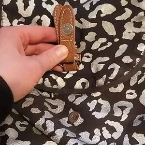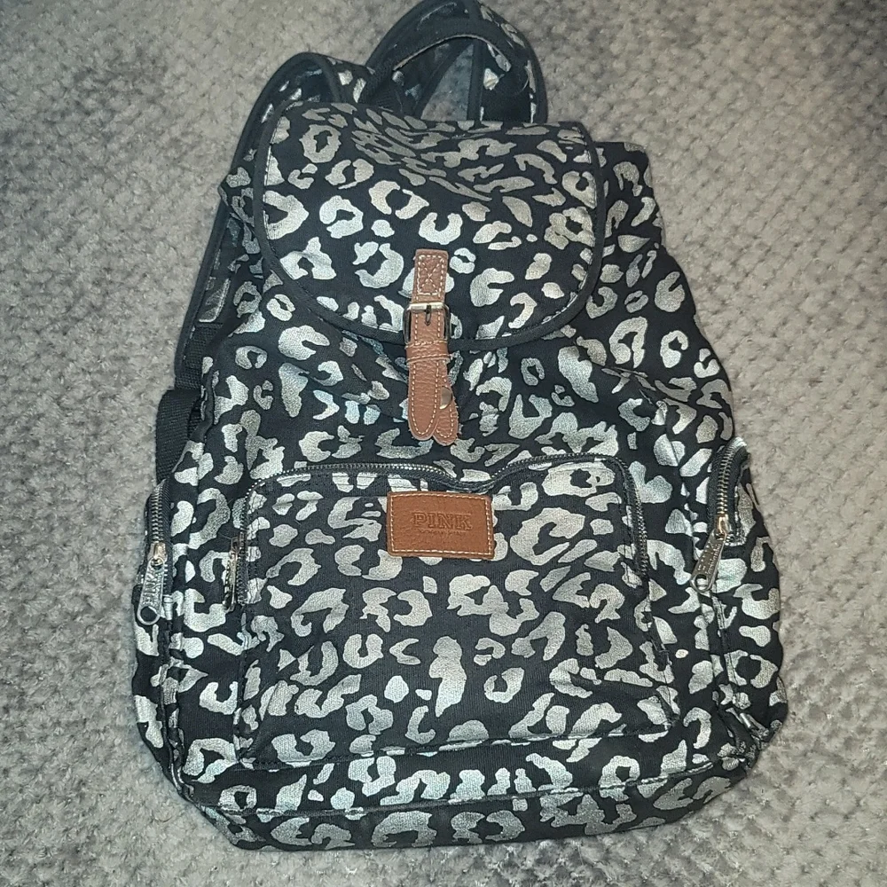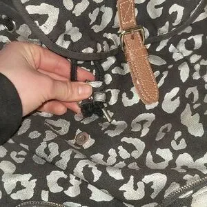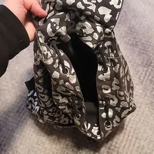 Drawstring backpack with magnetic button closure. one small pocket in front with 2 small pockets on both sides. The animal print is shiny! light signs of use. No flaws except for one of the ends of the drawstring is broken off-see pictures.