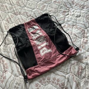 Stylish drawstring backpack in pink and black. Features bold 'PINK' logo. Has pockets for water bottles
