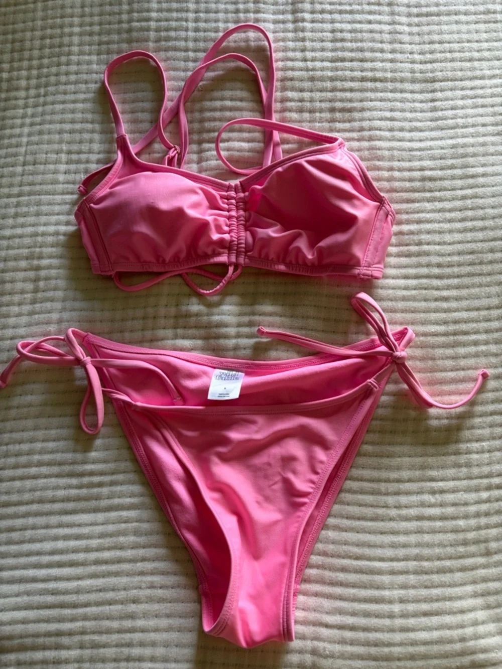 Bright pink two-piece bikini with adjustable tie sides. Ruched drawstring detail on the top. Smooth, stretchy swim fabric. Classic and flirty silhouette.