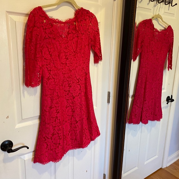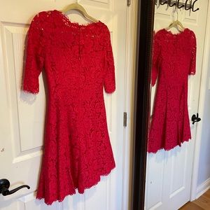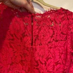 Pink floral print dress with 3/4 sleeves. Zip up which buttons at the top as well. Tight on top, flow from the waist down!