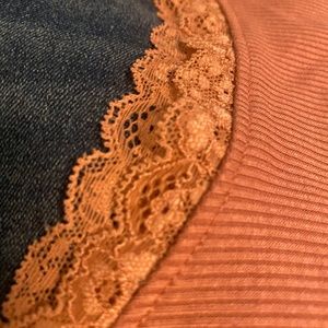 Short dress with lace collar and short sleeves. It’s dusty pink in color. It’s a bit above the knees in length. Fits a bit big due to collar’s wide size, it’s also stretchy.