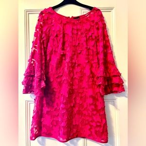 Cranberry cocktail or Fun dress , 3/4 length flowy sleeves, falls above the knee, fully lined , overlay with cut out flowers Size 4